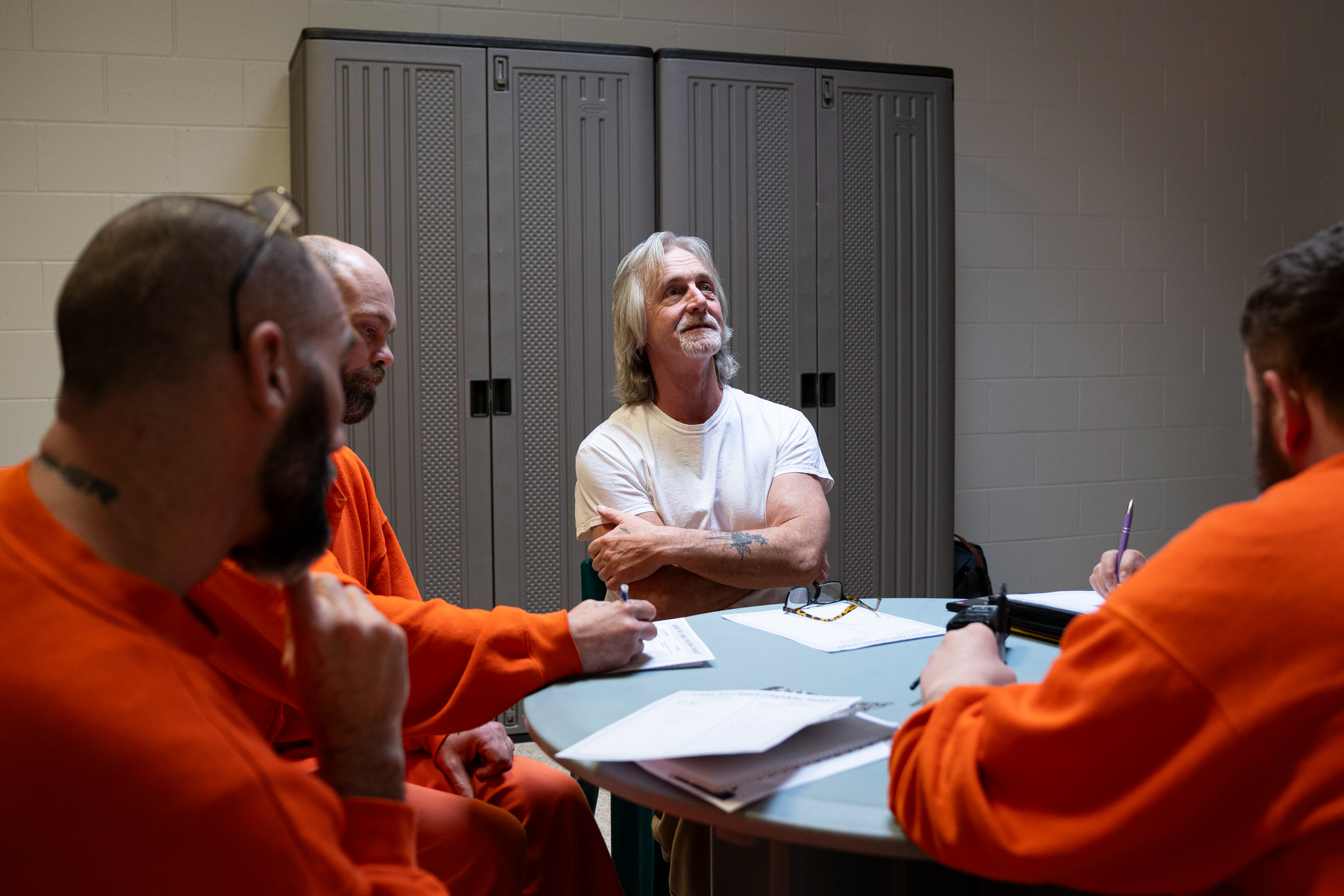 Kevin, 57, attends the substance use peer support group hosted by Catholic Human Services at the Missaukee County Jail on March 19, 2024, in Lake City, Mich.