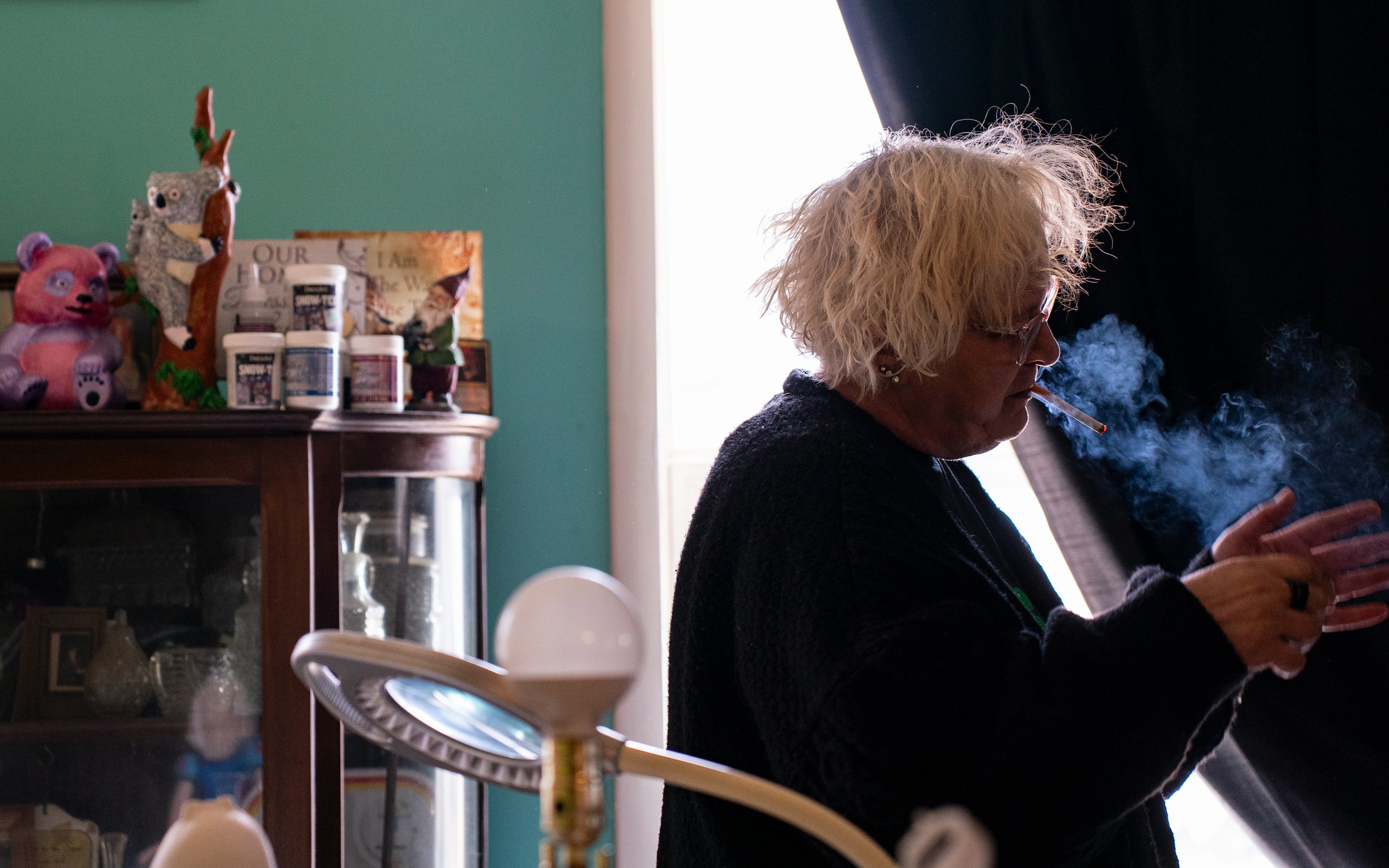 Robin lights a cigarette while talking to Hank about his sister on his first day out of Missaukee County Jail in 305 days on Saturday, March 30, 2024 in Lake City, Mich. “I hate to say it,” she said, “ but don’t hang out with her too much.”